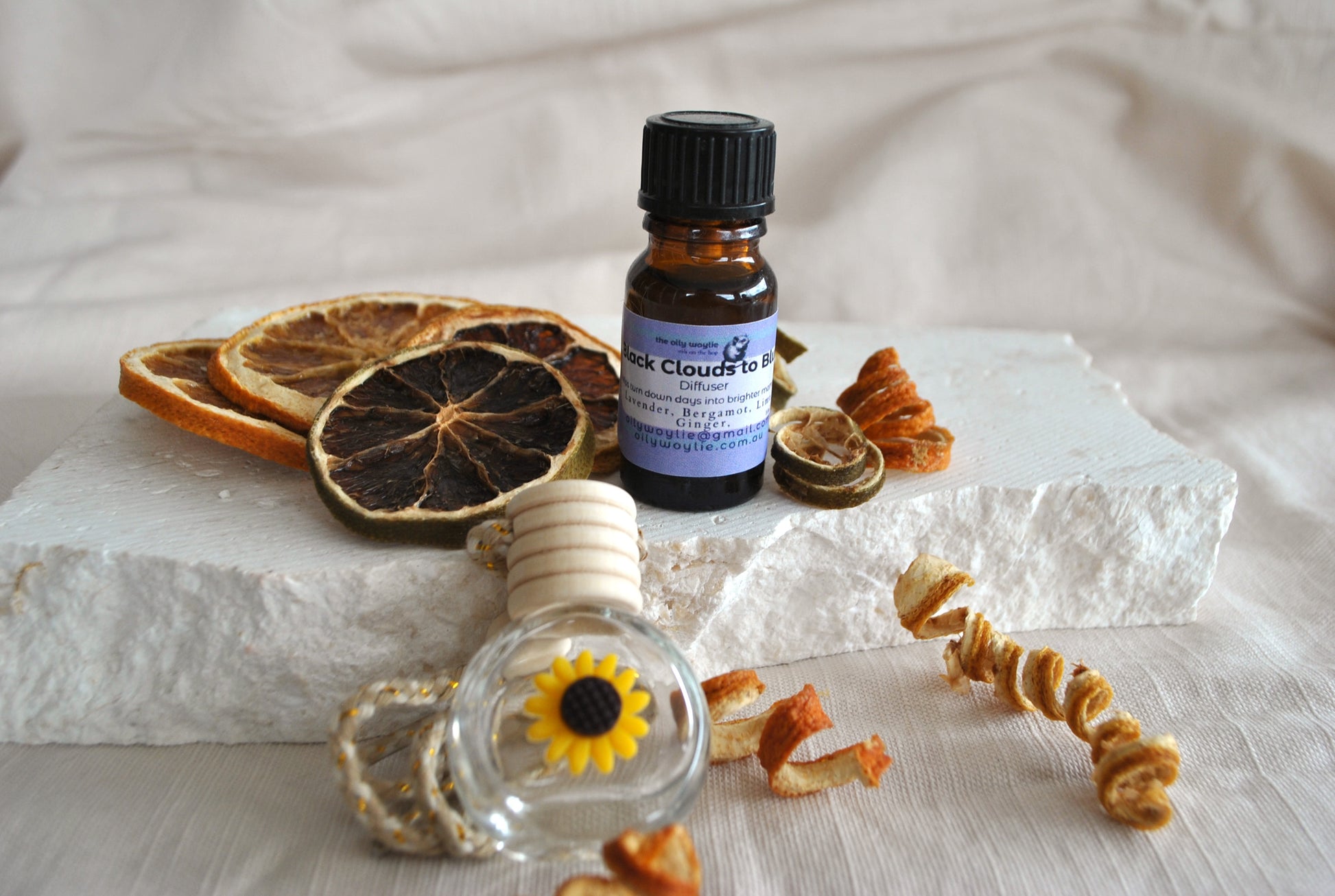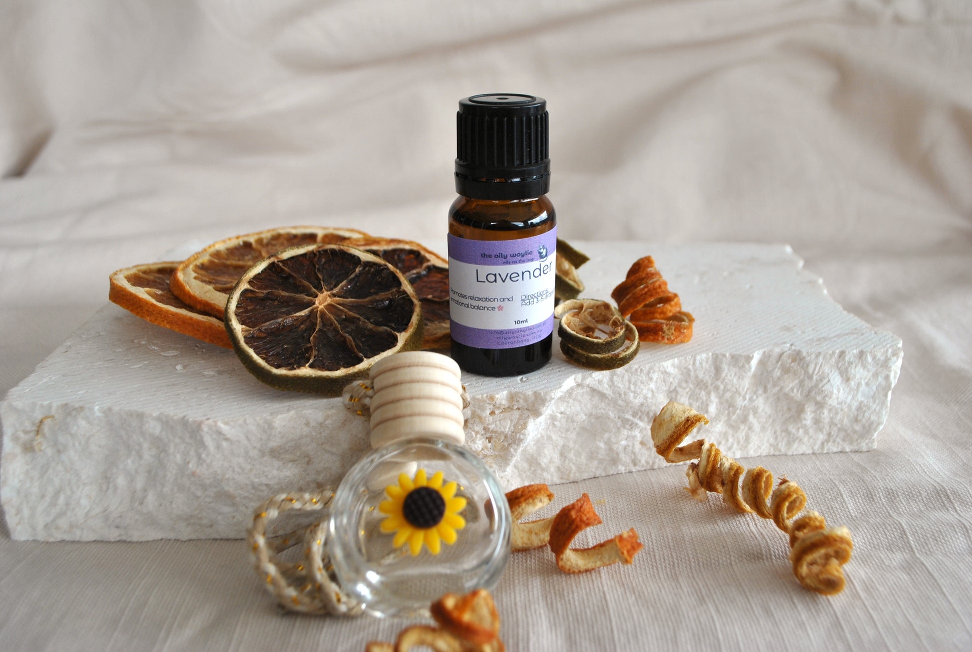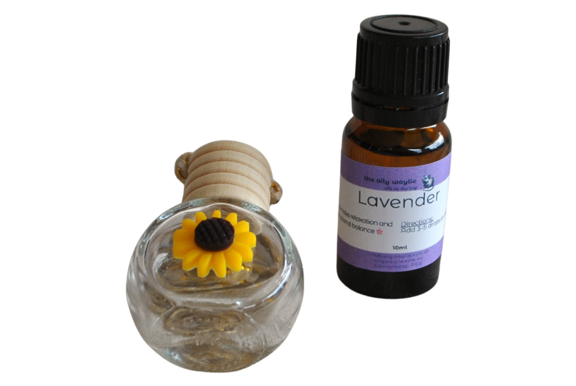 • Add 5–10 drops of your chosen essential oil blend onto the wooden/ceramic sunflower.
